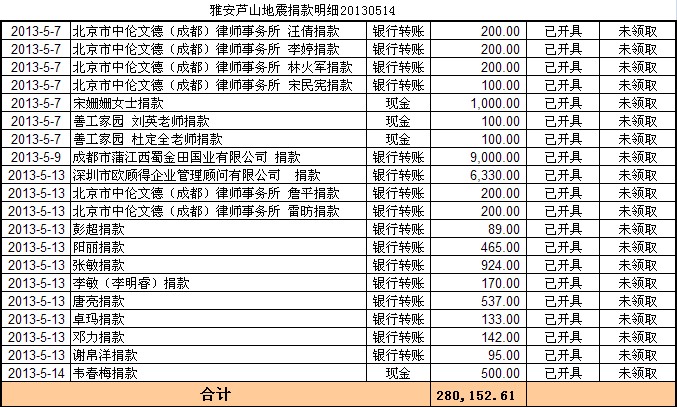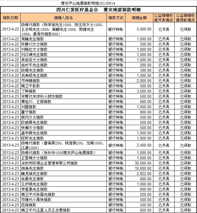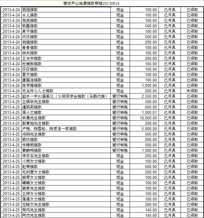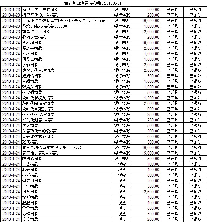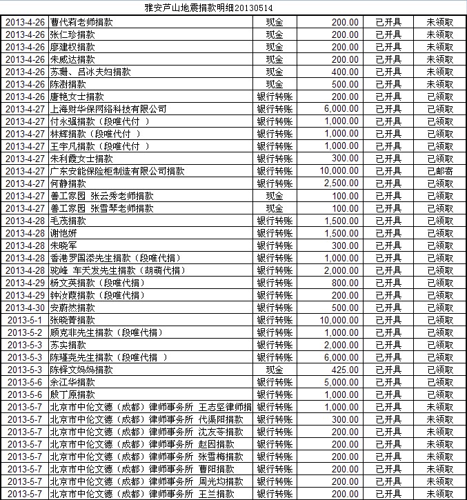 20130514基金会雅安地震援助计划募款清单