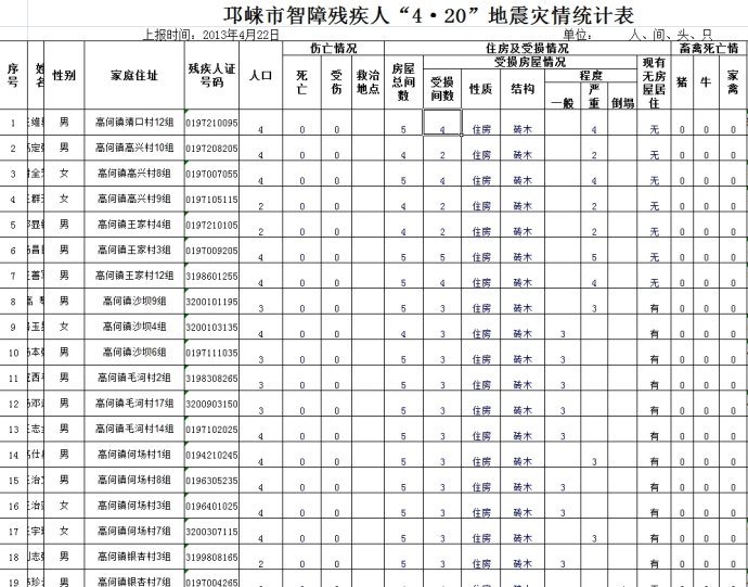 截止2013年5月14日,各位爱心人士和企业已通过基金会已为雅安地震智障家庭募款28万元,根据目前已拿到的邛崃高何镇、天台山镇、回龙镇,临琼镇、水口镇、夹关镇、火井镇、临济镇共167户智障家庭的受灾情况统计(为保护当事人隐私,已隐去姓名和身份证号码,原始数据将供后续社工组核查使用),预计后天(5月16日),基金会将通过武侯区残联和善工家园助残中心,向邛崃残联和邛崃智障亲友协会发放首批援助款,并开始监督援助款的逐户发放到位。