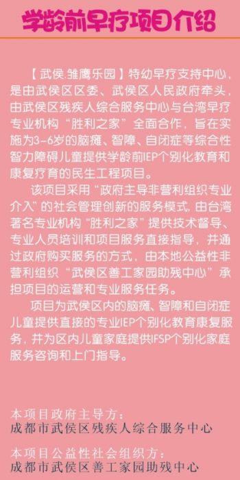 善工家园特殊儿童早疗项目,暨【武侯.雏鹰乐园】特幼早疗支持中心,是由武侯区区委、武侯区人民政府牵头,由武侯区残疾人综合服务中心与50年运营经验的台湾早疗专业机构“胜利之家”全面合作,旨在实施为3-6岁的脑瘫、智障、自闭症等综合性智力障碍儿童提供学龄前IEP个别化教育和康复疗育的民生工程项目。该项目采用“政府主导、非营利组织专业介入”的社会管理创新的服务模式,由台湾“胜利之家”提供技术督导、专业人员培训和项目服务直接指导,并通过政府购买服务的方式,由本地NGO公益性非营利组织“武侯区善工家园助残中心”承担项目的运营和专业服务任务。项目为武侯区内的脑瘫、智障和自闭症儿童提供直接的专业IEP个别化教育康复服务,并为区内儿童家庭提供IFSP个别化家庭服务咨询和上门指导。善工家园在该项目上的专职服务团队包含社会工作师(社工)、由特教老师和幼教老师构成的IEP主管老师、PT/OT治疗师、生活护理老师等多种专业协作成员。目前正为28名特殊儿童提供托养照料服务和IEP个别化早疗教育和康复干预服务。