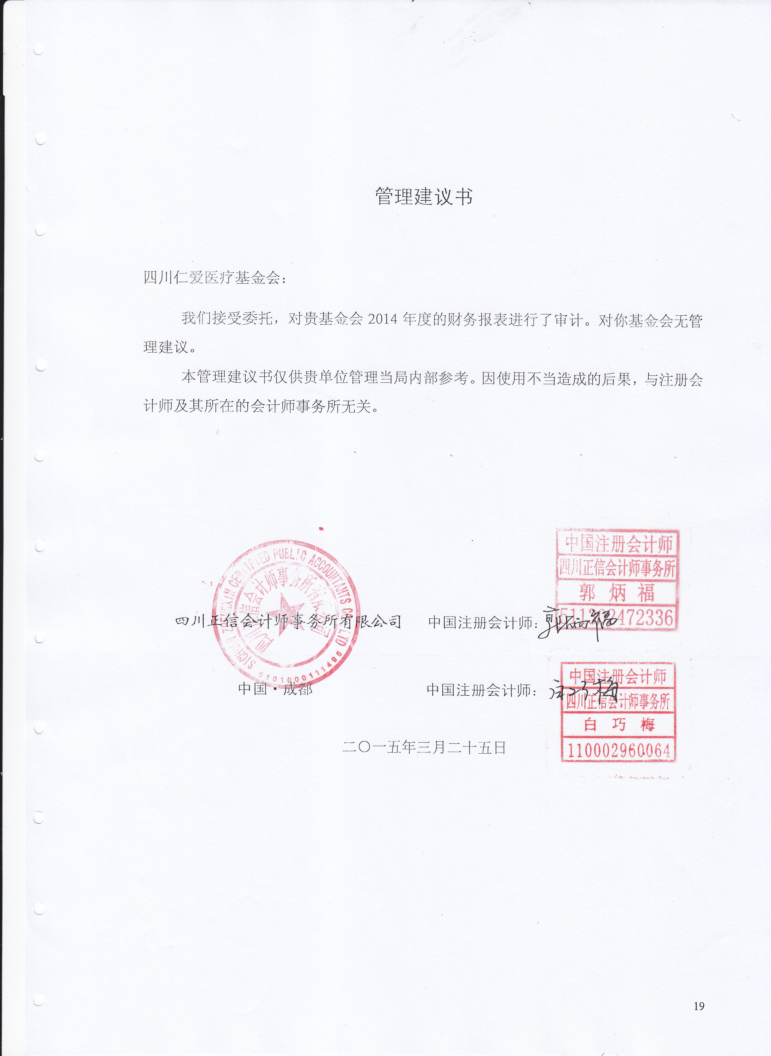 我们审计了后附的四川仁爱医疗基金会(以下简称:仁爱基金会)财务报表,包括2014年12月31日的资产负债表,2014年度的业务活动表和现金流量表以及财务报表附注。
