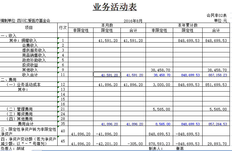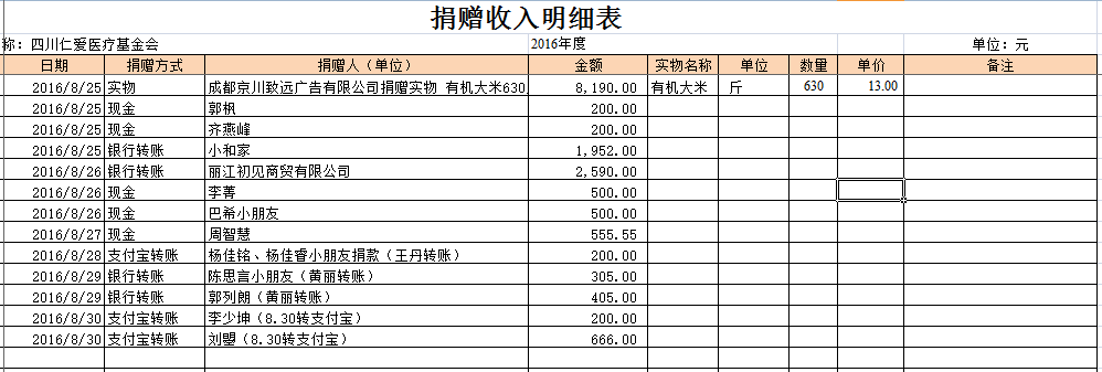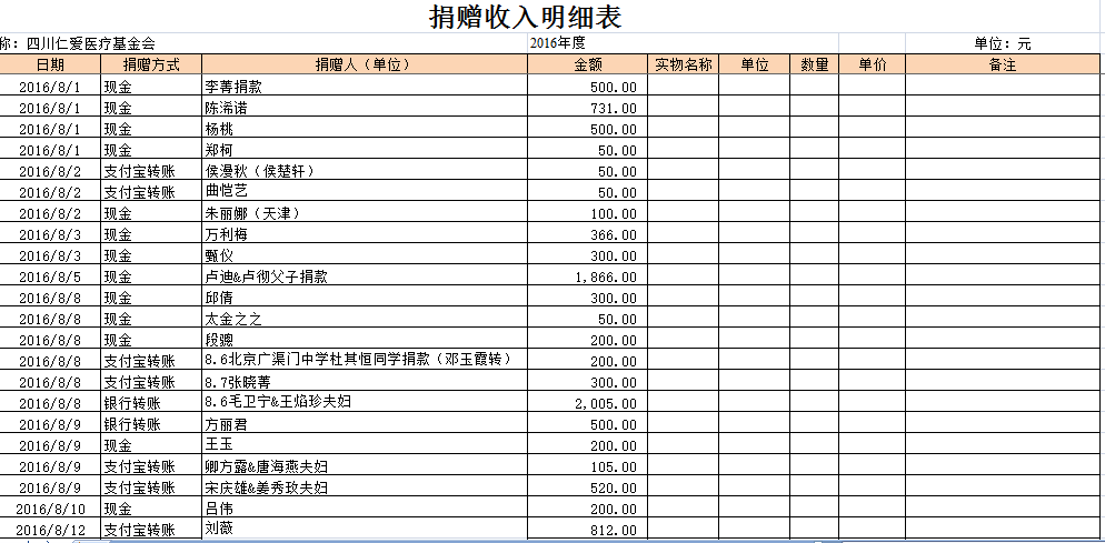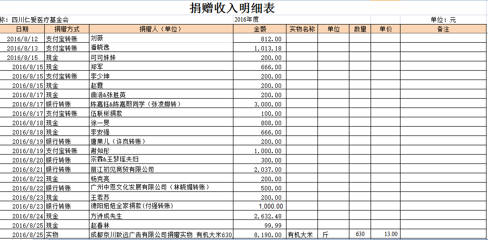 2016年8月捐赠收入及财务报表