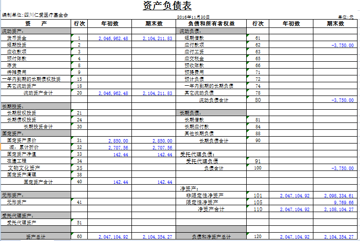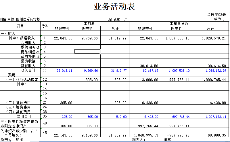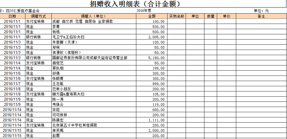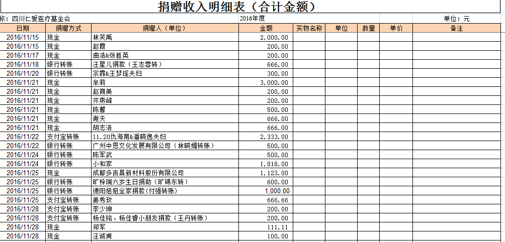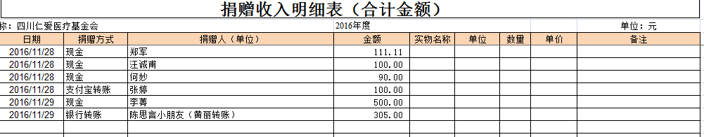 2016年11月捐赠收入及财务报表