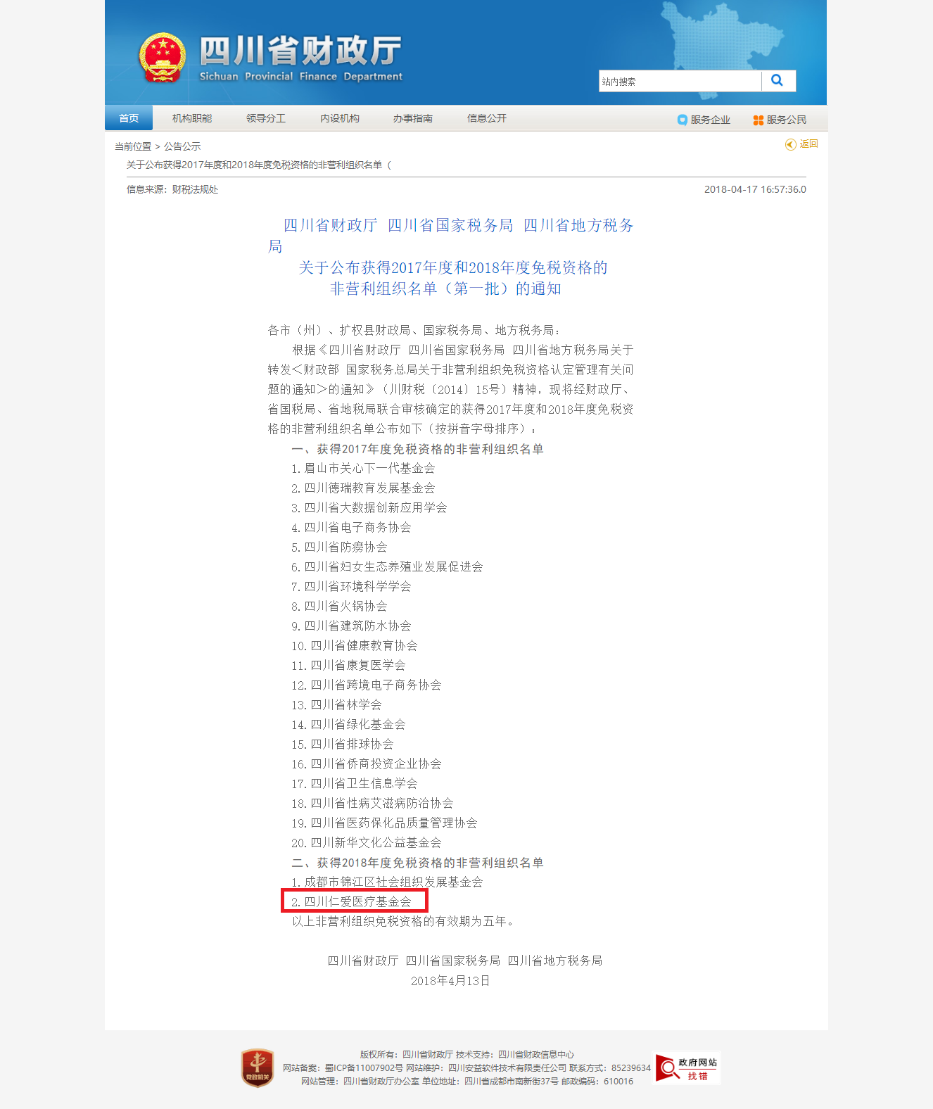 基金会获得2018年度非营利组织免税资格认定