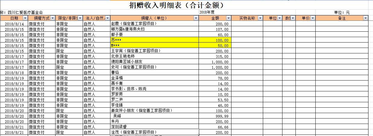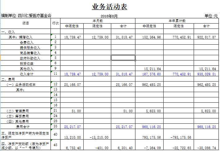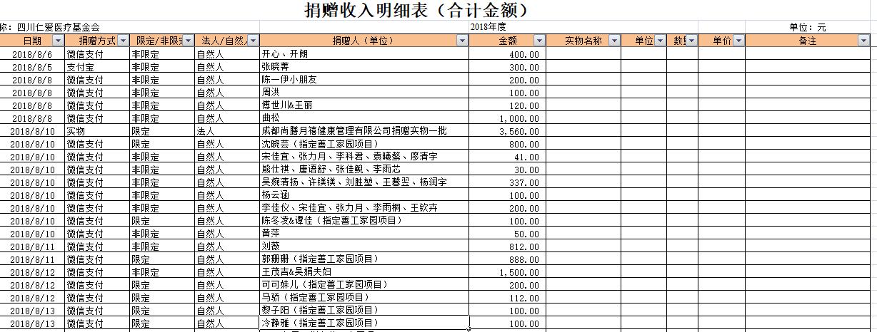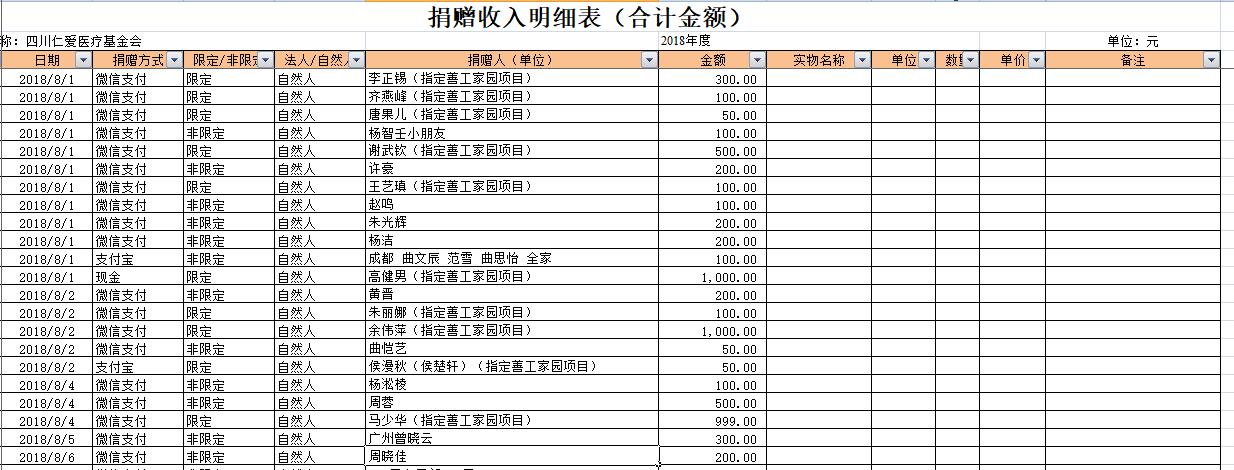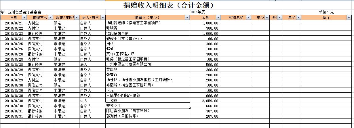 2018年8月捐赠收入及财务报表