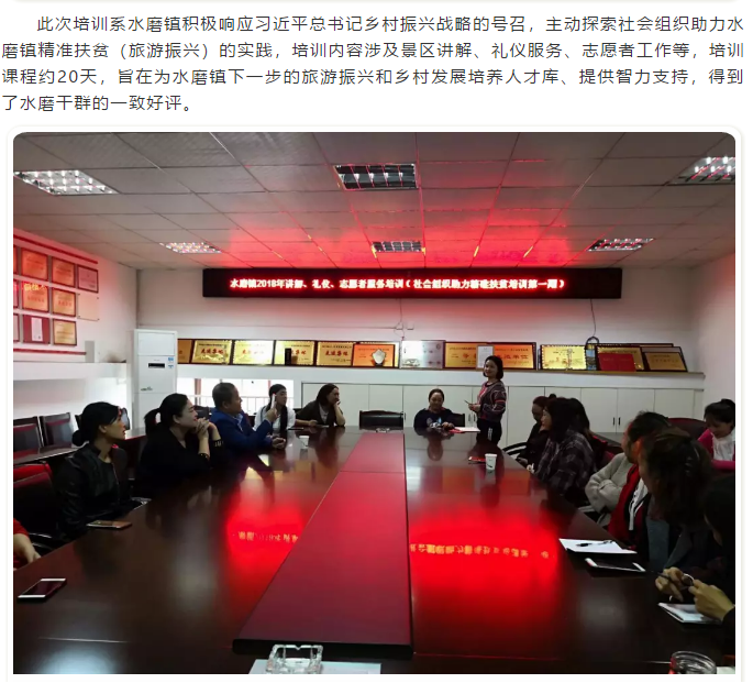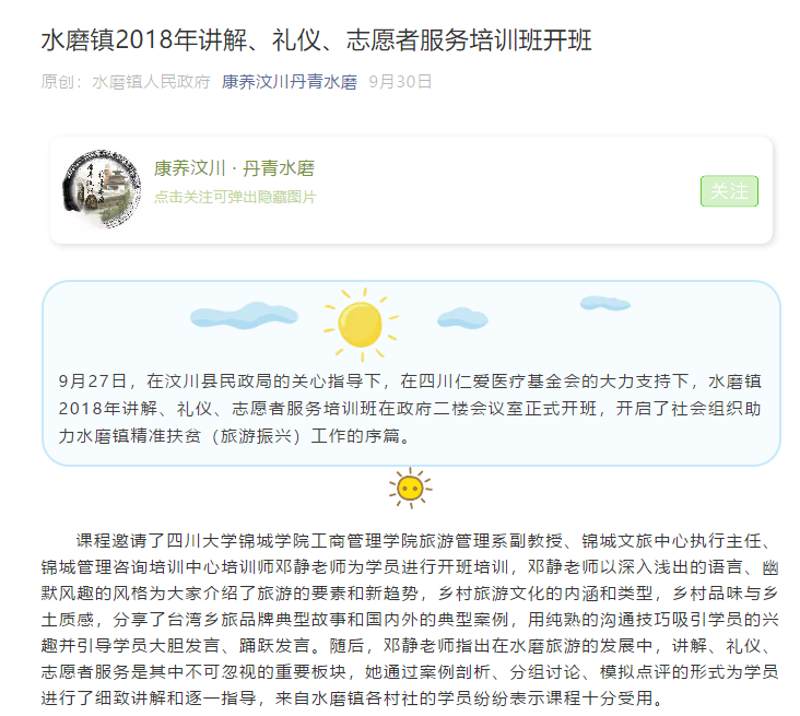 9月27日,在汶川县民政局的关心指导下,在四川仁爱医疗基金会的大力支持下,水磨镇2018年讲解、礼仪、志愿者服务培训班在政府二楼会议室正式开班,开启了社会组织助力水磨镇精准扶贫(旅游振兴)工作的序篇。