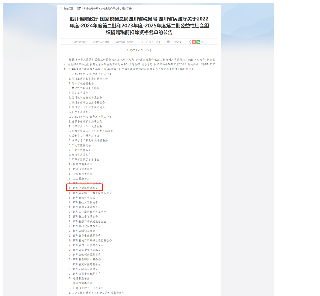 四川仁爱医疗基金会获得2023年度-2025年度公益性社会组织捐赠税前扣除资格