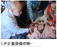 有一对父子同患疥疮、给于外用药膏并告诫要将衣被床单煮洗干净,有15岁女孩全身角质脱皮、羞于见人、整天躲在家中以棉被蒙头、给于去角质、激素、抗敏外用药膏,4岁可爱女童先天性双足内翻转、行走不便及两位骨折女孩无钱医治造成骨骼畸形、功能障碍、手握物无力及跛行,则建议去医院行骨科矫正。