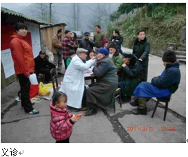 在什邡瓦窑村山上的村委会门口义诊,诊治约有55位病人,疾病有头晕、头痛、糖尿病、高血压、胃痛、关节痛、腰背痛、坐骨神经痛、感冒、咳嗽、支气管炎、白内障、失眠、脑中风、阴道炎白带…。我们自带药物(如:西咪替丁、复方氢氧化铝、阿司匹林、安乃近、尼莫地平、马来酸氯苯那、枸橼酸喷托维林、安茶碱、阴道片…等)治疗这些病人。