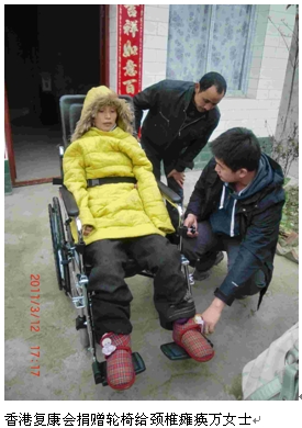 香港复康会四川震灾小区资源中心捐赠轮椅给颈椎瘫痪万女士(四周前曾探访万女士,即因她的需求向香港复康会申请轮椅获准而今送来,让万古容可以靠之走出家门)