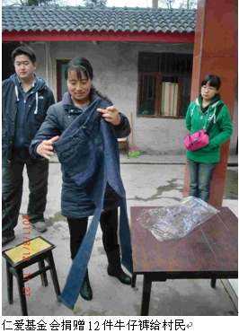 义诊中,仁爱基金会捐赠12件牛仔裤给乡民。